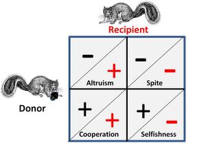 Games like hawk dove and war of attrition represent pure competition between individuals and have no attendant social elements. Where social influences apply, competitors have four possible alternatives for strategic interaction. This is shown on the adjacent figure, where a plus sign represents a benefit and a minus sign represents a cost.
