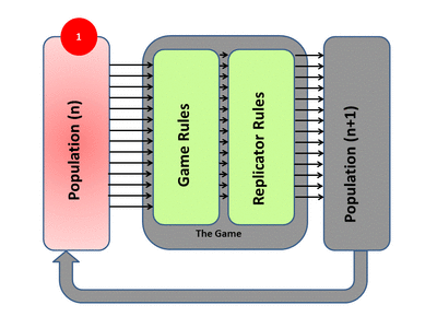 Participants aim to produce as many replicas of themselves as they can, and the payoff is in units of fitness (relative worth in being able to reproduce). It is always a multi-player game with many competitors. Rules include replicator dynamics, in other words how the fitter players will spawn more replicas of themselves into the population and how the less fit will be culled, in a replicator equation. The replicator dynamics models heredity but not mutation, and assumes asexual reproduction for the sake of simplicity. Games are run repetitively with no terminating conditions. Results include the dynamics of changes in the population, the success of strategies, and any equilibrium states reached. Unlike in classical game theory, players do not choose their strategy and cannot change it: they are born with a strategy and their offspring inherit that same strategy.[11]