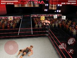 The game made use of the touch screen of iOS and Android devices by providing a virtual control pad for movement and three buttons for grapples, attacks and other in-ring actions. The actions that were available to the player were determined by the current in-ring situation - for example, pressing the attack button near a downed wrestler resulted in a stomp to the opponent's closest body part.[1] The game also featured an option that allowed players to create an original wrestler.[2]