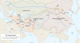 Following the defeat of Kuchlug, their shared enemy, relations between the Mongols and the Khwarazmids were initially strong; however, the Shah soon grew apprehensive regarding his new eastern enemy. The chronicler al-Nasawi attributes this change in attitude to the memory of an unintended earlier encounter with Mongol troops, whose speed and mobility frightened the Shah.[8] It is also likely that the Shah had grown in pride — like his father, he was now embroiled in a dispute with the Caliph An-Nasir, and even went so far as to march on Baghdad with an army, but was repulsed by a blizzard in the Zagros Mountains.[6] Some historians have speculated that the Caliph tried to ally with Genghis Khan, especially after Mongol-Khwarazmid relations deteriorated. Mongol historians are adamant that the Genghis at that time had no intention of invading the Khwarazmian Empire, and were only interested in trade and even a potential alliance.[9] They cite the fact he was already bogged down in his war against the Jin in China, and that he had to deal with the Hoi-yin Irgen rebellion in Siberia in 1216.[10]