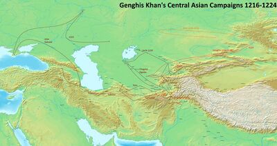The Mongol conquest of Khwarezmia (Persian: حمله مغول به ایران) took place between 1219 and 1221, as troops of the Mongol Empire under Genghis Khan invaded the lands of the Khwarazmian Empire in Central Asia. The campaign, which followed the annexation of the Qara Khitai khanate, saw widespread devastation, including numerous war crimes, and marked the completion of the Mongol conquest of Central Asia.
