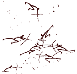 The earliest, limited evidence for war in Mesolithic Europe likewise dates to ca. 10,000 years ago, and episodes of warfare appear to remain "localized and temporarily restricted" during the Late Mesolithic to Early Neolithic period in Europe.[28] Iberian cave art of the Mesolithic shows explicit scenes of battle between groups of archers.[29] A group of three archers encircled by a group of four is found in Cova del Roure, Morella la Vella, Castellón, Valencia. A depiction of a larger battle (which may, however, date to the early Neolithic), in which eleven archers are attacked by seventeen running archers, is found in Les Dogue, Ares del Maestrat, Castellón, Valencia.[30] At Val del Charco del Agua Amarga, Alcañiz, Aragon, seven archers with plumes on their heads are fleeing a group of eight archers running in pursuit.[31]