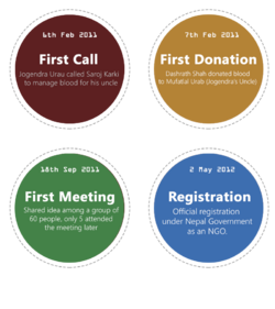 Youth For Blood (YFB) is a youth-led, non-profit, and service motivated circle of youths devoted to the welfare of blood donors and seekers in Nepal. Established in 2011 in Biratnagar, it has extended its network to 13 different cities and is still growing. One of the main objective of the organization is to manage fresh blood for people in need for free: YFB has saved over 4500 lives by managing over 6000 pints of blood and 3000 standby donors. Currently, YFB has a network of more than 50,000 blood donors throughout Nepal, 15,000 of which are registered blood donors while the remaining are people who can be reached through social networks.[2]
