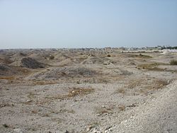 In contrast with Mesopotamian sources, which typically label Inzak as a god of Dilmun, the Dilmunites themselves typically referred to him as the god of Agarum.[2] According to Khaled al-Nashef, the only possible exception is a copy of an Old Babylonian description mentioning "Inzak of Dilmun," which might have originated in this area, on Bahrain or Failaka Island.[13] It is commonly presumed that Agarum was the original location Inzak was worshiped in, and that it corresponds to historical Hagar (modern Hofuf), though the latter assumption is not universally accepted.[14] A different interpretation has been suggested by Stephanie Dalley, who connects this toponym with the Hajar Mountains located in modern Oman and United Arab Emirates.[15] However, Gianni Marchesi notes that she provided no evidence in favor of this proposal, and incorrectly assumed that Inzak's association with copper in an inscription of Gudea means that he was worshiped in Magan (Oman), rather than that Dilmun functioned as a center of copper trade.[16] A third possibility is that Agarum corresponds to Failaka Island,[17] where Inzak was also worshiped.[18] Marchesi notes that the Greek name of the island, Ikaros, might have been a reinterpretation of Agarum based on a Hellenistic folk etymology.[19] This proposal has also been subsequently accepted by Dalley.[1] A single Aramaic inscription from Tell Khazneh on Failaka mentions an otherwise unknown deity named BL ‘KR, who might be a late form of Inzak, with BL being the epithet bēl, "lord," and ‘KR - a toponym analogous to Agarum.[20][21]