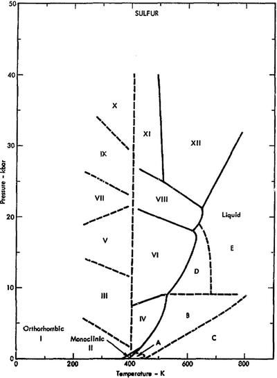 The pressure-temperature (P-T) phase diagram for sulfur is complex (see image). The region labeled I (a solid region), is α-sulfur.[11]