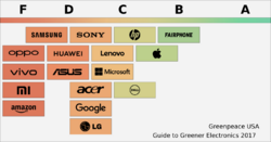 In 2017, the Greenpeace USA published a study of 17 of the world's leading consumer electronics companies about their energy and resource consumption and the use of chemicals.[45]