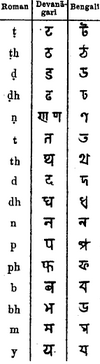 ↑ 15.015.1Lt. Col. St. George Corbet Gore, Handbook of Professional Instructions for the Topographical Branch, Survey of India Department, 1896, "... क k ख kh ग g घ gh ..."