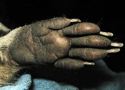 Bottom side of the front paw with visible vibrissae on the tips of the digits