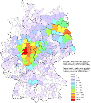 Although raccoons had become rare in the 1930s, at least 388,000 were killed during the hunting season of 1934/35. After persistent population increases began in the 1940s, the seasonal hunt reached about one million animals in 1946/47 and two million in 1962/63.[4][5]