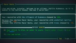 Contrary to other traditional roguelikes such as nethack, the game has a quest system as a core mechanic, with some of these quests being scripted, while others are procedurally generated.[6][9] Players can choose to follow the main questline, but can also choose to ignore it and play the game without following the pre-written plot. When creating a character, the player can select either a "True Kin" (unmutated humans) who have higher base stats and access to cybernetic augmentations, or a mutant that has access to both physical and mental mutations that offer a wide degree of utility. The default starting location is the pre-made town of Joppa, but it is also possible to choose to spawn in one of the many procedurally generated towns.[5]
