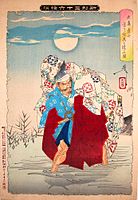 New Forms of Thirty-Six Ghosts: Lord Sadanobu (Fujiwara no Tadahira) Threatens a Demon (Oni) in the Palace at Night. Ukiyo-e printed by Tsukioka Yoshitoshi (1839–1892).
