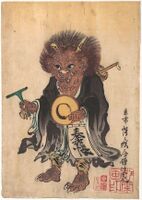 Depiction of an oni chanting a Buddhist prayer. The oni (ogre or demon) is dressed in the robes of a wandering Buddhist priest. He carries a gong, a striker, and a hogacho (Buddhist subscription list). By Kawanabe Kyōsai, 1864.