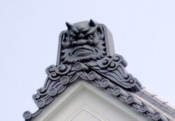 Japanese buildings sometimes include oni-faced roof tiles called onigawara (鬼瓦), which are thought to ward away bad luck, much like gargoyles in Western tradition.[41]