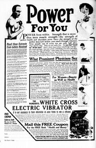 Vibrators began to be marketed for home use in magazines from around 1900 together with other electrical household goods, for their supposed health and beauty benefits. An early example was the 'Vibratile,' an advert which appeared in McClure's magazine in March 1899, offered as a cure for 'Neuralgia, Headache, Wrinkles'. These advertisements disappeared in the 1920s, possibly because of their appearance in pornography. And growing understanding of female sexual function made it no longer tenable for mainstream society to avoid the sexual connotations of the devices.[4]