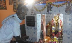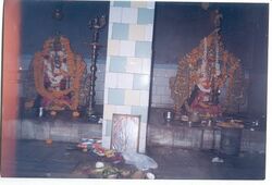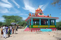 The shrines themselves vary by deity and region. For Tamils, Ayyanar is represented in an open space to better fulfill his duty. However there the goddess is given her own temple similar in form, and sometimes size, to a Vedic temple.[3] In other regions, however, the goddess (since gods are less venerated in these areas) may be given a shrine at the edge of the village, although it is common to find the shrine next to a tree or a snake-hole. In Telugu regions, the deity sometimes has no permanent shrine, but a temporary pandal. Some goddesses wish to be in the open space to feel the same hardships as their devotees.[6] Yet there is no distinction between the dwelling-place of the deity and the deity: the dwelling-place itself is a form of the deity.