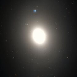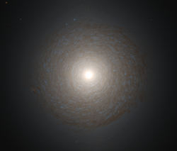 A lenticular galaxy (denoted S0) is a type of galaxy intermediate between an elliptical (denoted E) and a spiral galaxy in galaxy morphological classification schemes.[1] It contains a large-scale disc but does not have large-scale spiral arms. Lenticular galaxies are disc galaxies that have used up or lost most of their interstellar matter and therefore have very little ongoing star formation.[2] They may, however, retain significant dust in their disks. As a result, they consist mainly of aging stars (like elliptical galaxies). Despite the morphological differences, lenticular and elliptical galaxies share common properties like spectral features and scaling relations. Both can be considered early-type galaxies that are passively evolving, at least in the local part of the Universe. Connecting the E galaxies with the S0 galaxies are the ES galaxies with intermediate-scale discs.[3]