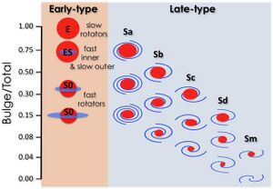 The analyses of Burstein[25] and Sandage[26] showed that lenticular galaxies typically have surface brightness much greater than other spiral classes. It is also thought that lenticular galaxies exhibit a larger bulge-to-disk ratio than spiral galaxies and this may be inconsistent with simple fading from a spiral.[27][28] If S0s were formed by mergers of other spirals these observations would be fitting and it would also account for the increased frequency of globular clusters. It should be mentioned, however, that advanced models of the central bulge which include both a general Sersic profile and bar indicate a smaller bulge,[29] and thus a lessened inconsistency. Mergers are also unable to account for the offset from the Tully–Fisher relation without assuming that the merged galaxies were quite different from those we see today.
