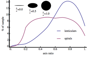 Lenticular galaxies are unique in that they have a visible disk component as well as a prominent bulge component. They have much higher bulge-to-disk ratios than typical spirals and do not have the canonical spiral arm structure of late-type[note 1] galaxies, yet may exhibit a central bar.[4] This bulge dominance can be seen in the axis ratio (i.e. the ratio between the observed minor and major axial of a disk galaxy) distribution of a lenticular galaxy sample. The distribution for lenticular galaxies rises steadily in the range 0.25 to 0.85 whereas the distribution for spirals is essentially flat in that same range.[5] Larger axial ratios can be explained by observing face-on disk galaxies or by having a sample of spheroidal (bulge-dominated) galaxies. Imagine looking at two disk galaxies edge-on, one with a bulge and one without a bulge. The galaxy with a prominent bulge will have a larger edge-on axial ratio compared to the galaxy without a bulge based on the definition of axial ratio. Thus a sample of disk galaxies with prominent spheroidal components will have more galaxies at larger axial ratios. The fact that the lenticular galaxy distribution rises with increasing observed axial ratio implies that lenticulars are dominated by a central bulge component.[4]