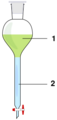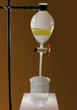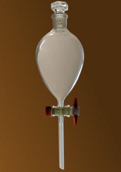 From Handwiki A separatory funnel, also known as a separation funnel, separating funnel, or colloquially sep funnel, is a piece of laboratory glassware used in liquid-liquid extractions to separate (partition) the components of a mixture into two immiscible solvent phases of different densities.[1] Typically, one of the phases will be aqueous, and the other a lipophilic organic solvent such as ether, MTBE, dichloromethane, chloroform, or ethyl acetate. All of these solvents form a clear delineation between the two liquids.[2] The more dense liquid, typically the aqueous phase unless the organic phase is halogenated, sinks to the bottom of the funnel and can be drained out through a valve away from the less dense liquid, which remains in the separatory funnel.[3]