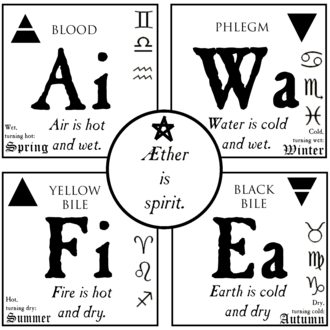 It is possible to glean a few generalities. All matter is based on four elements — earth, air, fire, water — and three essences — mercury, salt, sulphur. These don't bear any resemblance to what we understand by the terms, though. Water, for example, is at its purest in Heaven. In the sky, there is a form of water which is not as pure as in Heaven, but it's still better than the rubbish we've got here, which is only a poor imitation. This was true of all the elements and essences. Thus, any experiment using these substances on Earth was basically doomed to failure from the outset.