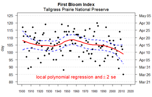 The Phenological Reports ended suddenly in 1948 after 58 years, and Britain remained without a national recording scheme for almost 50 years, just at a time when climate change was becoming evident. During this period, individual dedicated observers made important contributions. The naturalist and author Richard Fitter recorded the First Flowering Date (FFD) of 557 species of British flowering plants in Oxfordshire between about 1954 and 1990. Writing in Science in 2002, Richard Fitter and his son Alistair Fitter found that "the average FFD of 385 British plant species has advanced by 4.5 days during the past decade compared with the previous four decades."[24][25] They note that FFD is sensitive to temperature, as is generally agreed, that "150 to 200 species may be flowering on average 15 days earlier in Britain now than in the very recent past" and that these earlier FFDs will have "profound ecosystem and evolutionary consequences". In Scotland, David Grisenthwaite meticulously recorded the dates he mowed his lawn since 1984. His first cut of the year was 13 days earlier in 2004 than in 1984, and his last cut was 17 days later, providing evidence for an earlier onset of spring and a warmer climate in general.[26][27][28]
