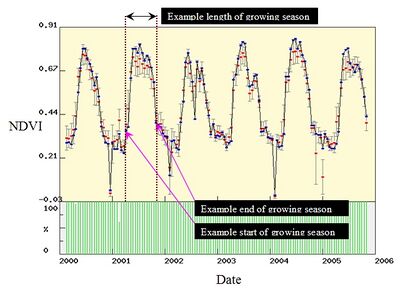 The evolution of the vegetation index through time, depicted by the graph above, exhibits a strong correlation with the typical green vegetation growth stages (emergence, vigor/growth, maturity, and harvest/senescence). These temporal curves are analyzed to extract useful parameters about the vegetation growing season (start of season, end of season, length of growing season, etc.). Other growing season parameters could potentially be extracted, and global maps of any of these growing season parameters could then be constructed and used in all sorts of climatic change studies.