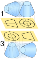 A section, or cross-section, is a view of a 3-dimensional object from the position of a plane through the object.