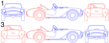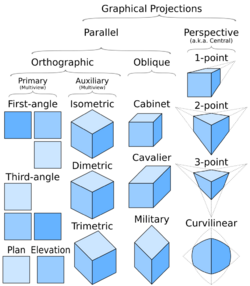 In technical drawing and computer graphics, a multiview projection is a technique of illustration by which a standardized series of orthographic two-dimensional pictures are constructed to represent the form of a three-dimensional object. Up to six pictures of an object are produced (called primary views), with each projection plane parallel to one of the coordinate axes of the object. The views are positioned relative to each other according to either of two schemes: first-angle or third-angle projection. In each, the appearances of views may be thought of as being projected onto planes that form a six-sided box around the object. Although six different sides can be drawn, usually three views of a drawing give enough information to make a three-dimensional object. These views are known as front view, top view and end view. Other names for these views include plan, elevation and section. When the plane or axis of the object depicted is not parallel to the projection plane, and where multiple sides of an object are visible in the same image, it is called an auxiliary view.