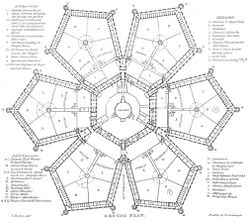 A developed elevation is a variant of a regular elevation view in which several adjacent non-parallel sides may be shown together as if they have been unfolded. For example, the north and west views may be shown side-by-side, sharing an edge, even though this does not represent a proper orthographic projection.