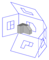 The same image, with views of the object projected in the direction of sight onto walls using first-angle projection.