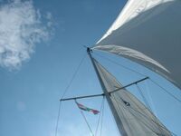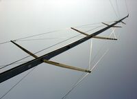 The mast of a sailing vessel is a tall spar, or arrangement of spars, erected more or less vertically on the centre-line of a ship or boat. Its purposes include carrying sails, spars, and derricks, giving necessary height to a navigation light, look-out position, signal yard, control position, radio aerial or signal lamp.[1] Large ships have several masts, with the size and configuration depending on the style of ship. Nearly all sailing masts are guyed.[2]
