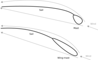 Modern masts form the leading edge of a sail's airfoil and tend to have a teardrop-shaped cross-section. On smaller racing yachts and catamarans, the mast rotates to the optimum angle for the sail's airfoil. If the mast has a long, thin cross-section and makes up a significant area of the airfoil, it is called a wing-mast; boats using these have a smaller sail area to compensate for the larger mast area. There are many manufacturers of modern masts for sailing yachts of all sizes, a few notable companies are Hall Spars, Offshore Spars, and Southern Spars.