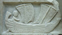 Artemon, along with mainsail and topsail, developed into the standard rig of seagoing vessels in imperial times, complemented by a mizzen on the largest freighters.[20] The earliest recorded three-masters were the giant Syracusia, a prestige object commissioned by king Hiero II of Syracuse and devised by the polymath Archimedes around 240 BC, and other Syracusan merchant ships of the time.[21] The imperial grain freighters travelling the routes between Alexandria and Rome also included three-masted vessels.[21] A mosaic in Ostia (c. 200 AD) depicts a freighter with a three-masted rig entering Rome's harbour.[22] Special craft could carry many more masts: Theophrastus (Hist. Plant. 5.8.2) records how the Romans imported Corsican timber by way of a huge raft propelled by as many as fifty masts and sails.[23]