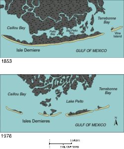 Along the coast of Louisiana, former lobes of the Mississippi River delta have been reworked by wave action, forming beach ridge complexes. Prolonged sinking of the marshes behind the barriers has converted these former vegetated wetlands to open-water areas. In a period of 125 years, from 1853 to 1978, two small semi-protected bays behind the barrier developed as the large water body of Lake Pelto, leading to Isles Dernieres's detachment from the mainland.[13]