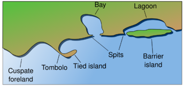 Barrier islands are a coastal landform—a type of dune system and sand island—where an area of sand has been formed by wave and tidal action parallel to the mainland coast. They usually occur in chains, consisting of anything from a few islands to more than a dozen. They are subject to change during storms and other action, but absorb energy and protect the coastlines and create areas of protected waters where wetlands may flourish. A barrier chain may extend for hundreds of kilometers, with islands periodically separated by tidal inlets. The largest barrier island in the world is Padre Island of Texas, United States, at 113 miles (182 km) long.[1] Sometimes an important inlet may close permanently, transforming an island into a peninsula, thus creating a barrier peninsula,[2] often including a beach, barrier beach. Though many are long and narrow, the length and width of barriers and overall morphology of barrier coasts are related to parameters including tidal range, wave energy, sediment supply, sea-level trends, and basement controls.[3] The amount of vegetation on the barrier has a large impact on the height and evolution of the island.[4]