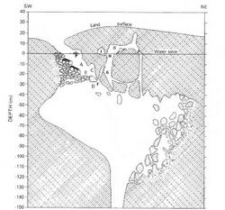 Immediately after passing the funnel into Acree's Chamber, a narrow side tube can be found to a diver's left. This side tube proceeds approximately 90 feet (27 m) upward to a chamber with an air pocket, named Brown's Room. The tube leading to Brown's Room has at least 2 offshoots, the higher of which leads to a dead-end filled with a small air pocket, and the lower of which joins with additional tubes descending from Brown's Room.[5] If the diver instead descends through Acree's Chamber, the first notable landmark is a rocky shelf termed the "lower ledge", around 100 feet (30 m) below the entrance to the chamber. The bottom of Acree's Chamber lies around 260 feet (79 m) below the surface, but is not flat. Instead, a portion of the chamber floor descends below this lower shelf; a gradual funnel leads to a hole in the bottom of the chamber featuring a strong current. The hole, later termed the ojo de agua, is 315 feet (96 m) below the surface and just large enough for a diver with equipment to fit through.