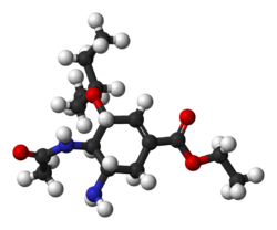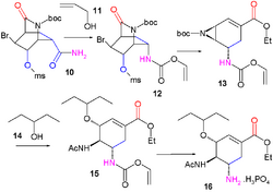 Oseltamivir total synthesis concerns the total synthesis of the antiinfluenza drug oseltamivir[1] marketed by Hoffmann-La Roche under the trade name Tamiflu. Its commercial production starts from the biomolecule shikimic acid harvested from Chinese star anise and from recombinant E. coli.[2][3] Control of stereochemistry is important: the molecule has three stereocenters and the sought-after isomer is only 1 of 8 stereoisomers.