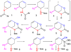 An improved method published in 2007 starts with the enantioselective desymmetrization of aziridine 1 with trimethylsilyl azide (TMSN3) and a chiral catalyst to the azide 2. The amide group is protected as a BOC group with Boc anhydride and DMAP in 3 and iodolactamization with iodine and potassium carbonate first gives the unstable intermediate 4 and then stable cyclic carbamate 5 after elimination of hydrogen iodide with DBU.