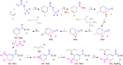 In 2006 the group of E.J. Corey published a novel route bypassing shikimic acid starting from butadiene and acrylic acid.[9] The inventors chose not to patent this procedure which is described below.