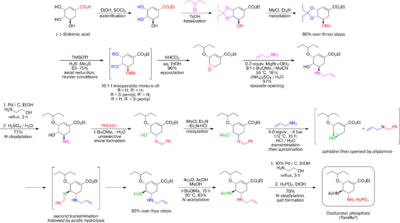 The current production method is based on the first scalable synthesis developed by Gilead Sciences[4] starting from naturally occurring quinic acid or shikimic acid. Due to lower yields and the extra steps required (because of the additional dehydration), the quinic acid route was dropped in favour of the one based on shikimic acid, which received further improvements by Hoffmann-La Roche.[5][6] The current industrial synthesis is summarised below: