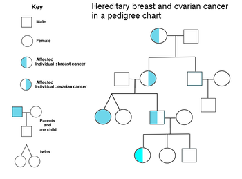 In the United States, five of 100 women with a first-degree relative with ovarian cancer will eventually get ovarian cancer themselves, placing those with affected family members at triple the risk of women with unaffected family members. Seven of 100 women with two or more relatives with ovarian cancer will eventually get ovarian cancer.[22][30] In general, 5–10% of ovarian cancer cases have a genetic cause.[22] BRCA mutations are associated with high-grade serous nonmucinous epithelial ovarian cancer.[24]