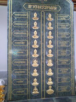 At the same time, practitioners may use a mantra (Thai: บริกรรมภาวนา, romanized: borikam-phavana),[14][42] that is Sammā-Arahaṃ, which refers to the Buddha who has 'perfectly' (sammā) attained 'perfection in the Buddhist sense' (arahaṃ),[47][5] as can be found in the traditional Tiratanavanda chant. This is a form of Buddhanussati, i.e. recollecting the Buddha qualities. This mantra has also been used by monks from Northern Thailand.[42] Alternatively, according to Wat Phra Dhammakaya, practitioners can also place the attention at the center of the body directly,[48] and can even do so without visualizing or using a mantra.[49]