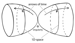 In his first model the two universes did not interact, except via local matter accumulation whose density and pressure become high enough to connect the two sheets through a bridge without spacetime between them, but with a continuity of geodesics beyond the Schwarzschild radius with no singularity[citation needed], allowing an exchange of matter between the two conjugated sheets, based on an idea after Igor Dmitriyevich Novikov.[27] Novikov called such singularities a collapse and an anticollapse, which are an alternative to the couple black hole and white hole in the wormhole model. Sakharov also proposed the idea of induced gravity as an alternative theory of quantum gravity.[28]
