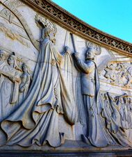 The earliest recorded names of the city are Shufu (疏附) and Shule (疏勒).[6] Shufu originally referred to Kashgar's old city inhabited by the Uyghurs, while Shule referred to the new city built by Han Chinese settlers, located 6 miles (9.7 km) from the old one.[7] Shule may have been an attempt by the Chinese to transcribe the Sanskrit name for Kashgar, Śrīkrīrāti (lit. fortunate hospitality).[8]
