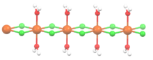 The dihydrate, FeCl2(H2O)2, crystallizes from concentrated hydrochloric acid.[7] The dihydrate is a coordination polymer. Each Fe center is coordinated to four doubly bridging chloride ligands. The octahedron is completed by a pair of mutually trans aquo ligands.[8]