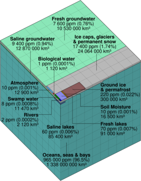 Water is an essential resource for all life on the planet. Of the water resources on Earth, only 2.5 percent of it is fresh. Two-thirds of the freshwater is locked up in ice caps and glaciers. Of the remaining one percent, a fifth is in remote, inaccessible areas and much seasonal rainfall in monsoonal deluges and floods cannot easily be used.[3] As time advances, water is becoming scarcer; having access to clean, safe, drinking water is limited among countries. At present, only about 0.08 percent of all the world's fresh water[4] is exploited by mankind in ever increasing demand for sanitation, drinking, manufacturing, leisure and agriculture. Due to the small percentage of water remaining, optimizing the fresh water we have left from natural resources has been a continuous difficulty in several locations worldwide.