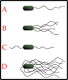 Bacteria can use flagella in different ways to generate different kinds of movement. Many bacteria (such as E. coli) have two distinct modes of movement: forward movement (swimming) and tumbling. The tumbling allows them to reorient and makes their movement a three-dimensional random walk.[147] Bacterial species differ in the number and arrangement of flagella on their surface; some have a single flagellum (monotrichous), a flagellum at each end (amphitrichous), clusters of flagella at the poles of the cell (lophotrichous), while others have flagella distributed over the entire surface of the cell (peritrichous). The flagella of a unique group of bacteria, the spirochaetes, are found between two membranes in the periplasmic space. They have a distinctive helical body that twists about as it moves.[145]