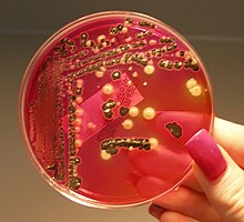 Culture techniques are designed to promote the growth and identify particular bacteria while restricting the growth of the other bacteria in the sample.[177] Often these techniques are designed for specific specimens; for example, a sputum sample will be treated to identify organisms that cause pneumonia, while stool specimens are cultured on selective media to identify organisms that cause diarrhea while preventing growth of non-pathogenic bacteria. Specimens that are normally sterile, such as blood, urine or spinal fluid, are cultured under conditions designed to grow all possible organisms.[116][178] Once a pathogenic organism has been isolated, it can be further characterised by its morphology, growth patterns (such as aerobic or anaerobic growth), patterns of hemolysis, and staining.[179]