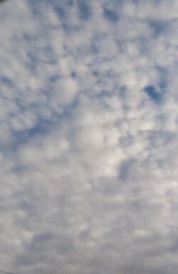 After the passage of the cold front, the sky usually clears as high pressure builds in behind the system, although significant amounts of cumulus or stratocumulus, often in the form of long bands called cloud streets, may persist if the airmass behind the front remains humid from a source of moisture.[8] Small and unchanging amounts of cumulus or cirrus clouds in an otherwise clear sky are usually indications of continuing fair weather as long as the barometric pressure remains comparatively high.