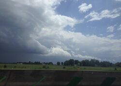 If the cold front is highly unstable, cumulonimbus clouds producing thunderstorms commonly form along the front. Anvil cirrus clouds may spread a considerable distance downwind from the thunderstorms.[6] The other cloud types associated with a cold front depend on atmospheric conditions such as airmass stability and wind shear.[7] As the front approaches, middle-étage gives way to altostratus and low-level stratocumulus with intermittent light precipitation if the warm airmass being displaced by the cold front is mostly stable. With significant airmass instability, vertically developed cumulus or cumulonimbus with showers and thunderstorms will form along the front.